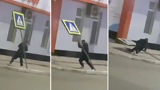 Momentul în care un bărbat doboară la pământ un indicator rutier